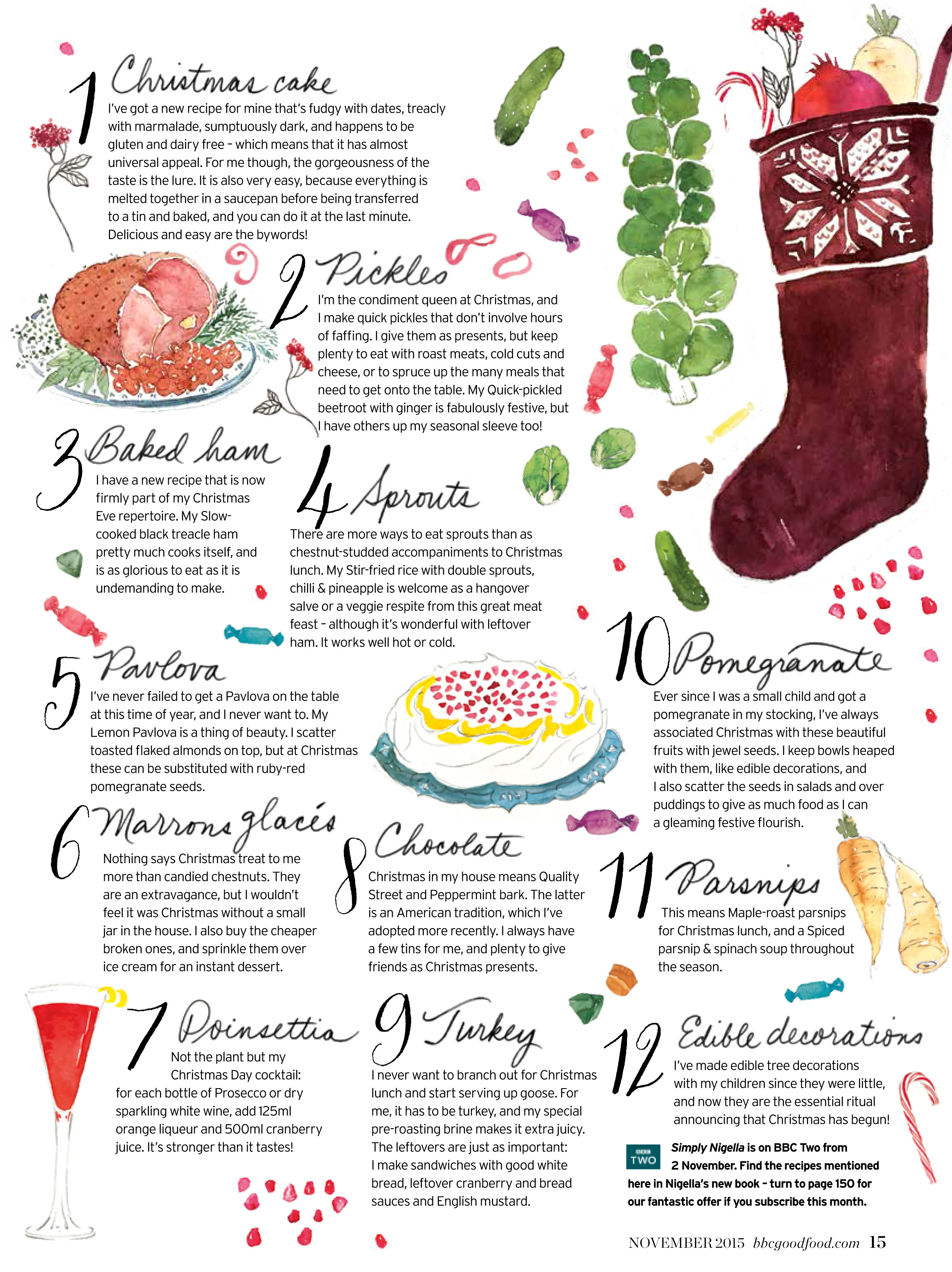 BBC Good Food magazine asked me to create this illustrated spread for Nigella's list of favorite Holiday foods for this feature in their December 2015 issue. They requested the art, like Nigella, to be elegant, pretty, glamorous. Also included are a holiday-themed, botanical border for her photo and handwritten titles for each illustrated item. Nigella even tweeted that she loves the illustrations!