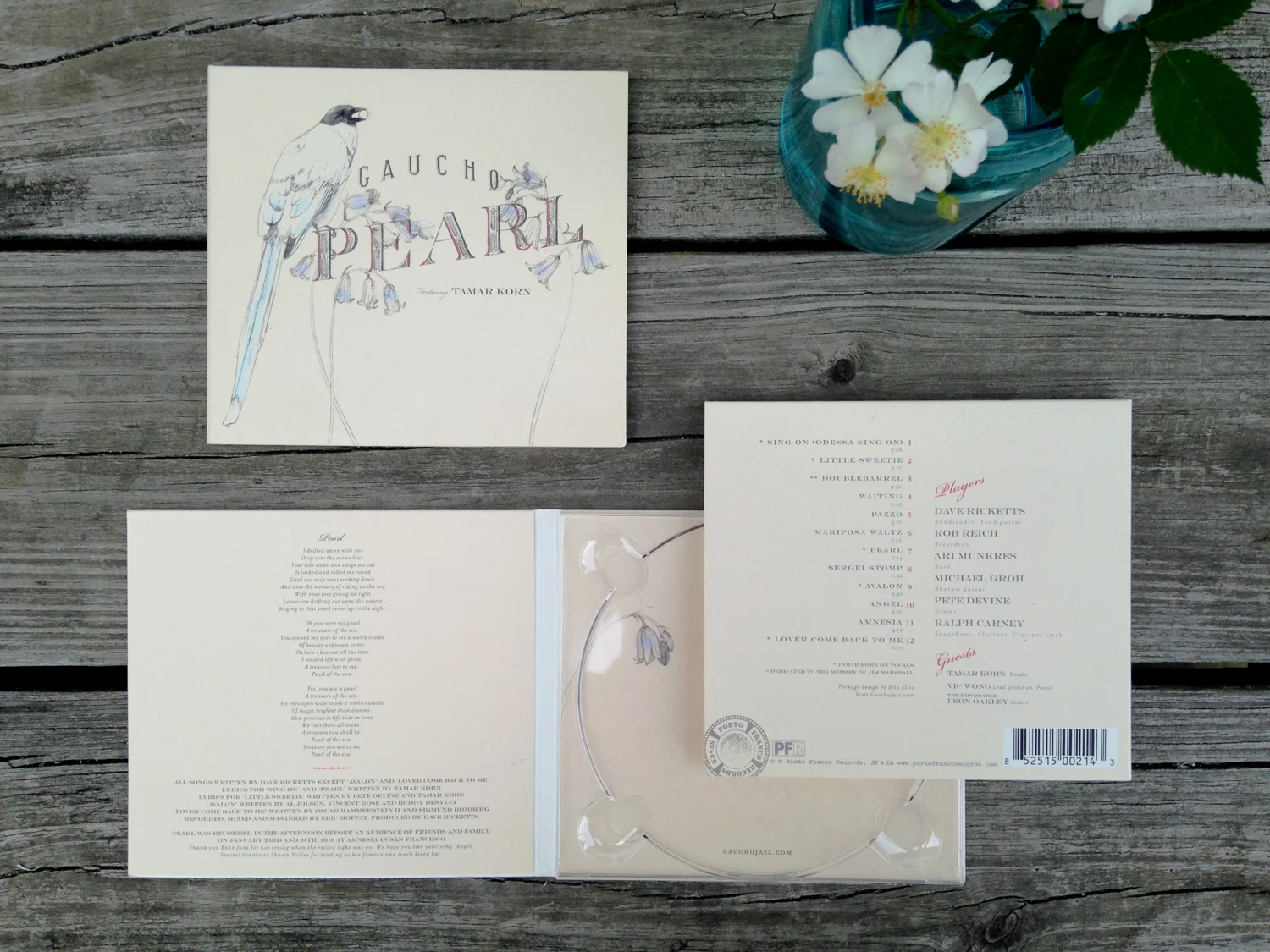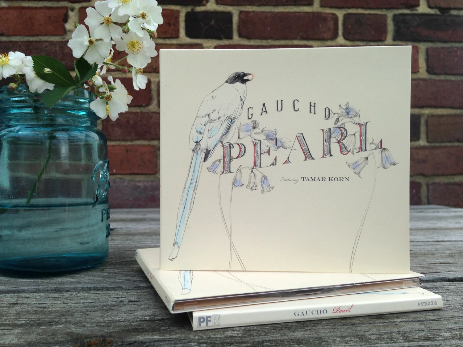 To complement the dreamy mood of this gypsy jazz album, I wanted to create a whimsical image that felt old-timey but not like an ad for baby powder. I chose delicate lilies of the valley, and an azure-billed magpie. The title track lilts along about a love far across the sea; this bird is found in China and hearing one sing is said to be a foretelling of happiness. I alluded to the pearl reference with the berry held delicately in the magpie's beak, and drew a decorative, engraver's-style lettering for the title.