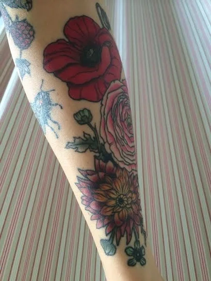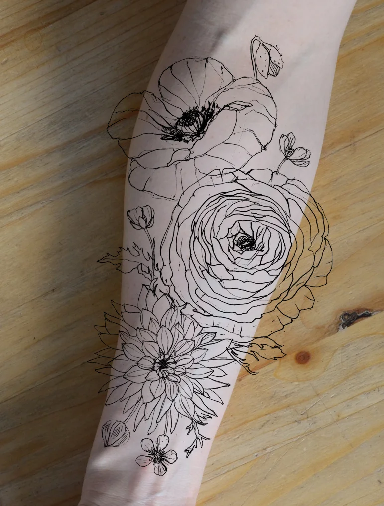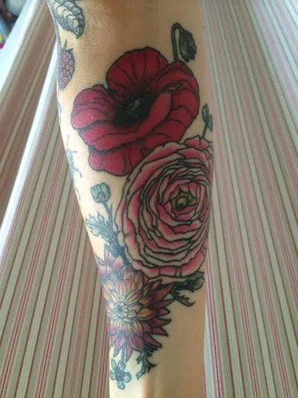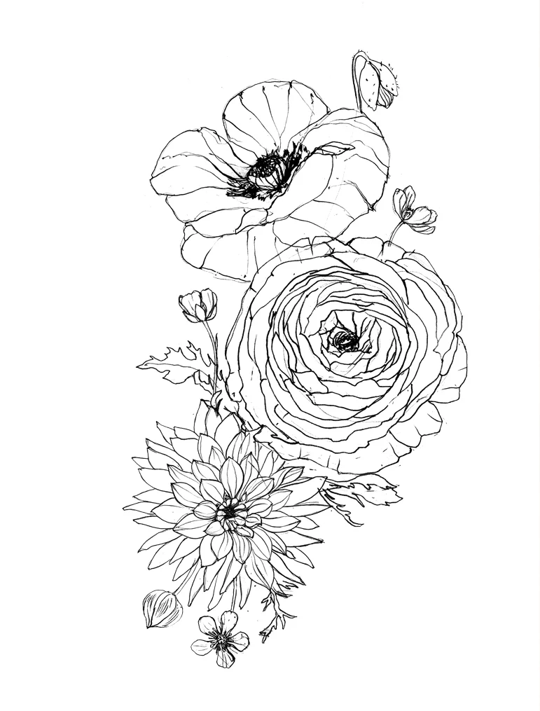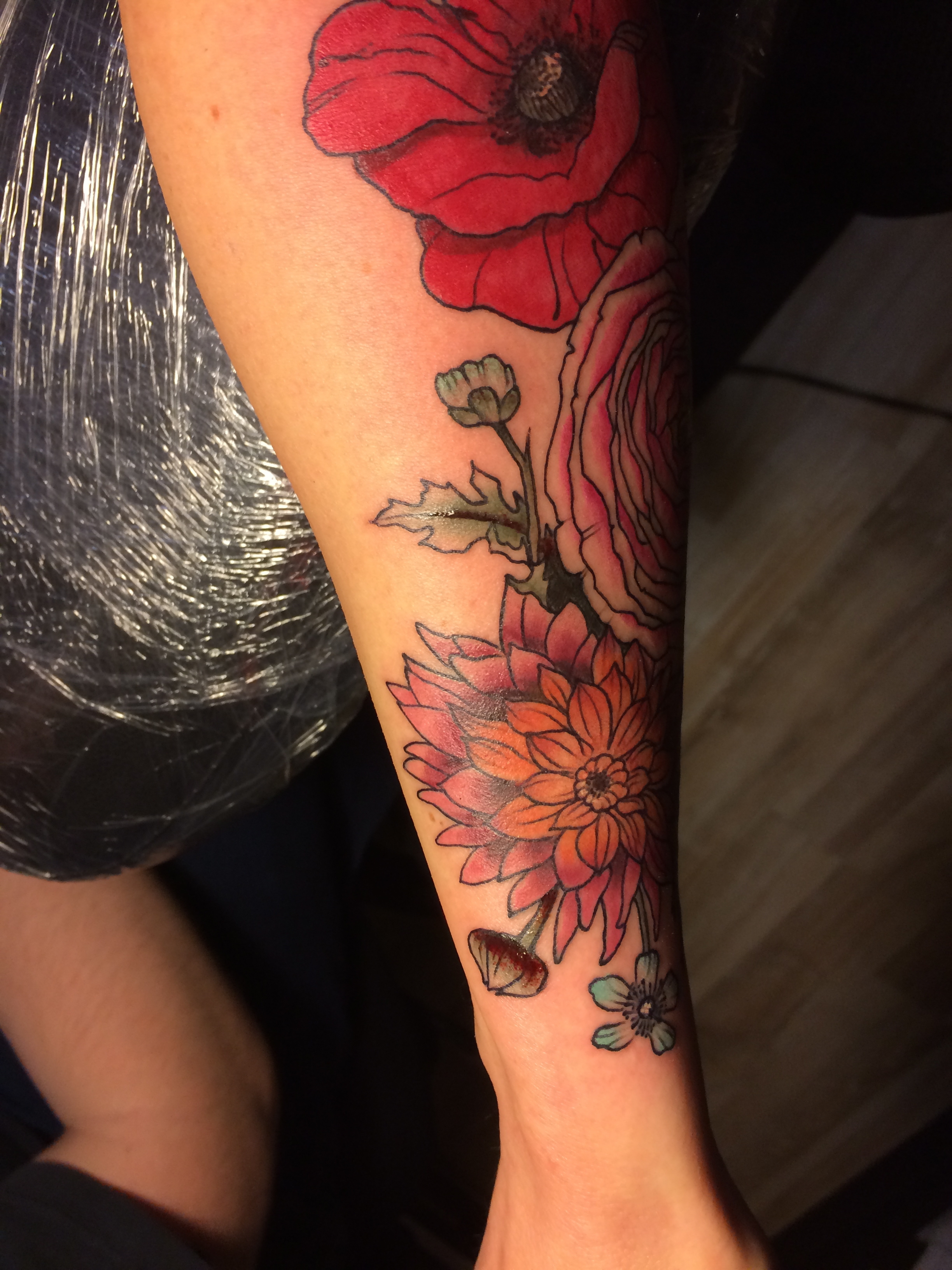 Poppies, ranunculus, dahlia, and buttercups for Sina. Inked by Sebastian Supp in Germany.