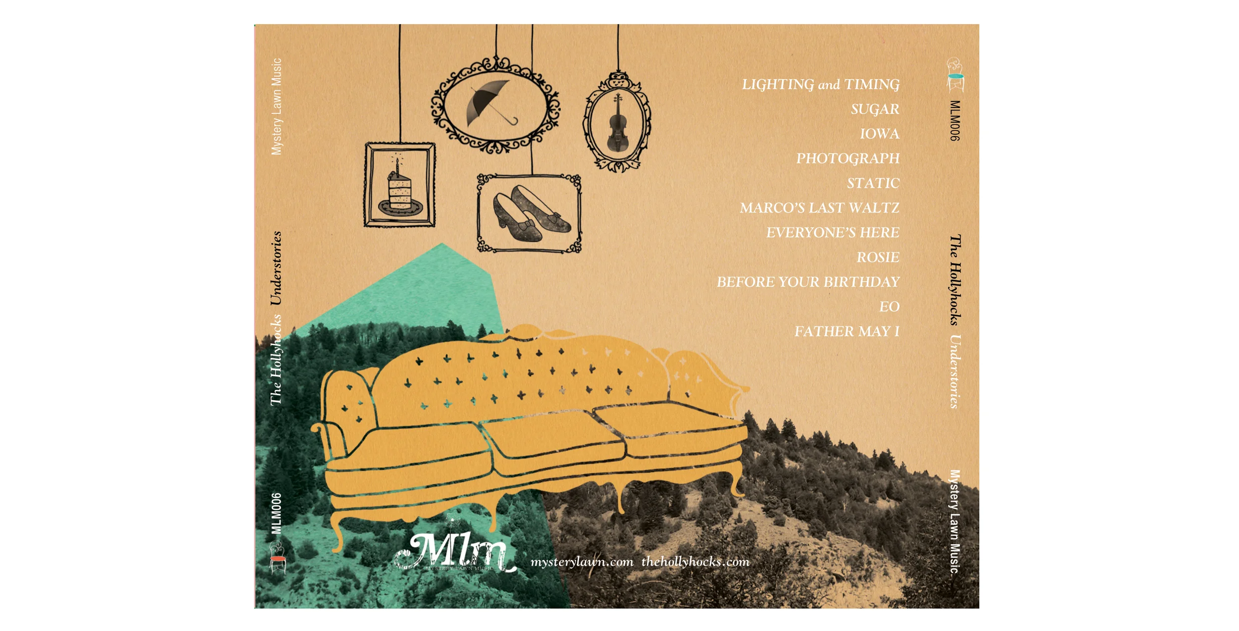 The Hollyhocks are a playful Bay Area rock 'n roll band. This album has a lot of contrasty inside/outside themes running through the lyrics. I ran with that, bringing various fixtures of an old fashioned sitting room into Bay Area landscapes.